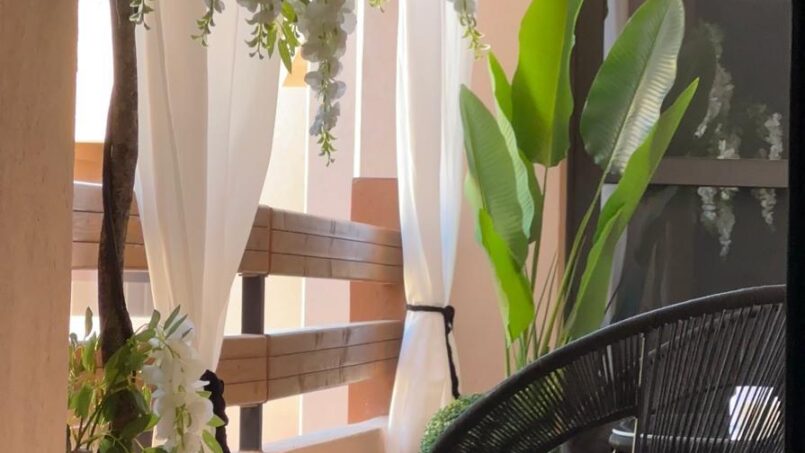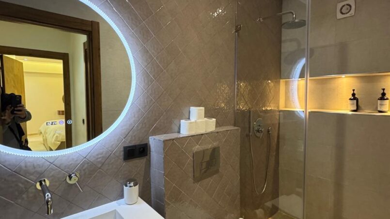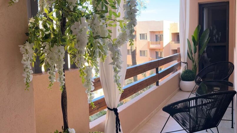 L’appartement dispose également d’un balcon ou d’une terrasse aménagée, véritable atout pour profiter du climat ensoleillé de Marrakech. Cet espace extérieur est idéal pour prendre un café le matin, se détendre en fin de journée ou simplement apprécier l’ambiance de la ville dans un cadre calme et privé.
