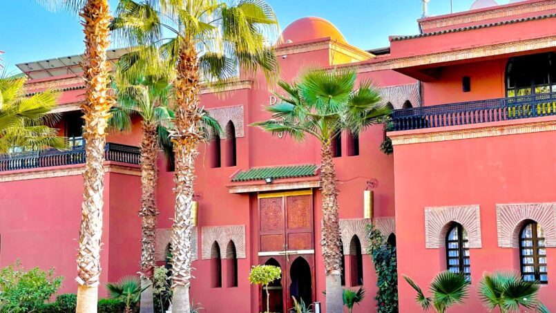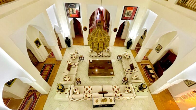 Architecture traditionnelle : arcs, couleurs sable, motifs marocains