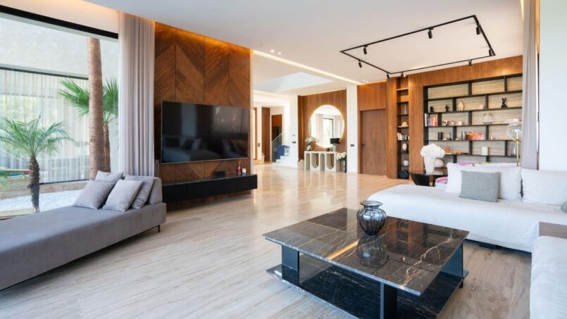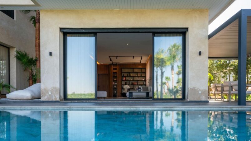 Grand salon ouvert sur la piscine, ambiance zen et minimaliste